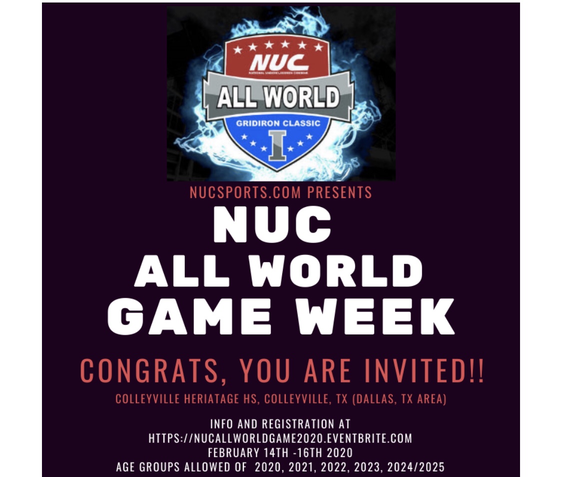 All Star Camps College Football Motivation NUC MVPS Recruits Results Final 24 hours to register for NUC All World Game 6 years ago Dave Schuman Register now and find out more info at Register Now Click Here About Author Dave Schuman See author's posts Tags: Final 24 hours to register for NUC All World Game Post navigation Previous How to Get Your Linebacker Skills To The Next LevelNext Chiefs Celebrating. When You Win You Get To Celebrate